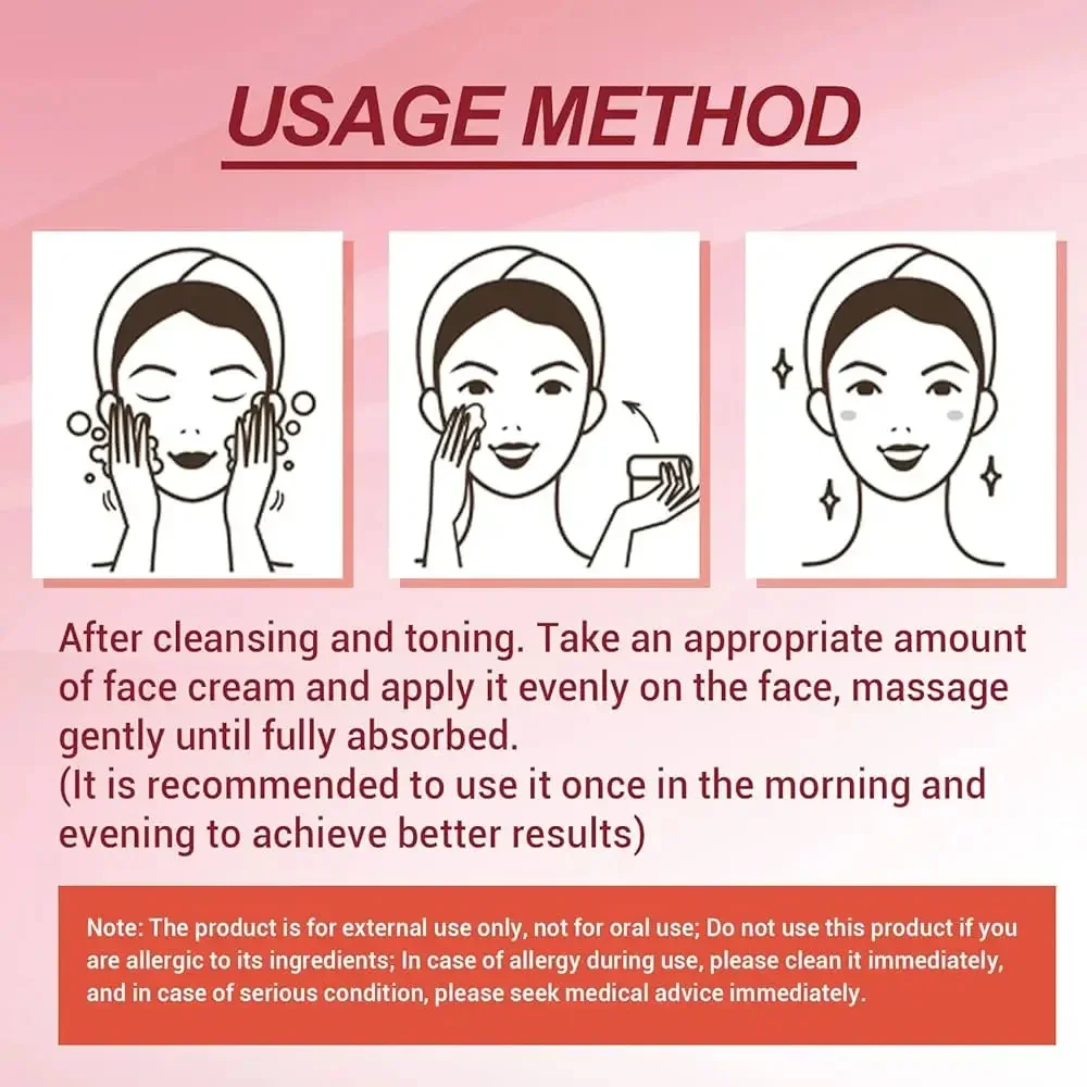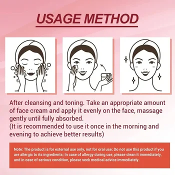 After cleansing, apply toner first, then apply an appropriate amount of cream onto your facial skin, and gently massage with fingers till it is fully absorbed.